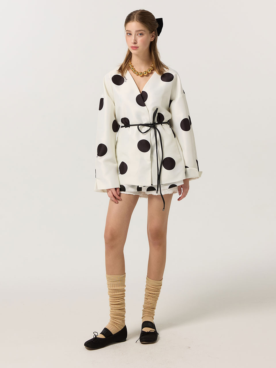 - 노카라 라인 도트 자켓과 셋업 연출 가능.