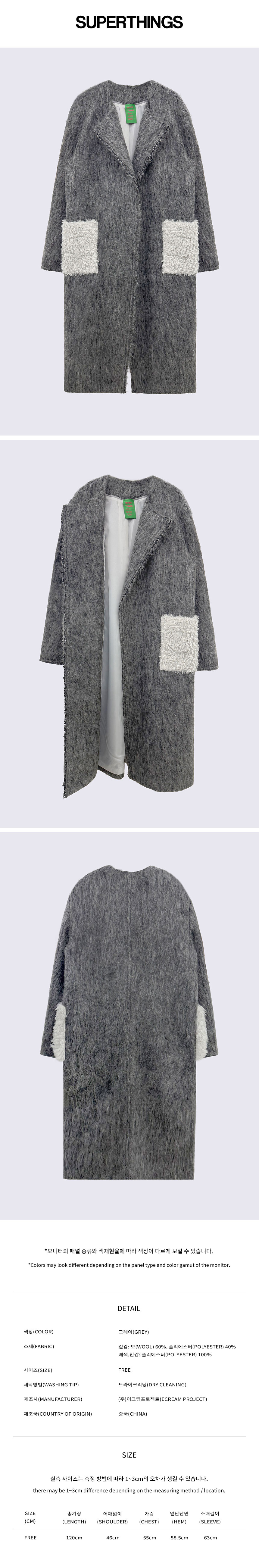 총장 120 어깨넓이 46 가슴단면 55 밑단단면 58.5 소매길이 63