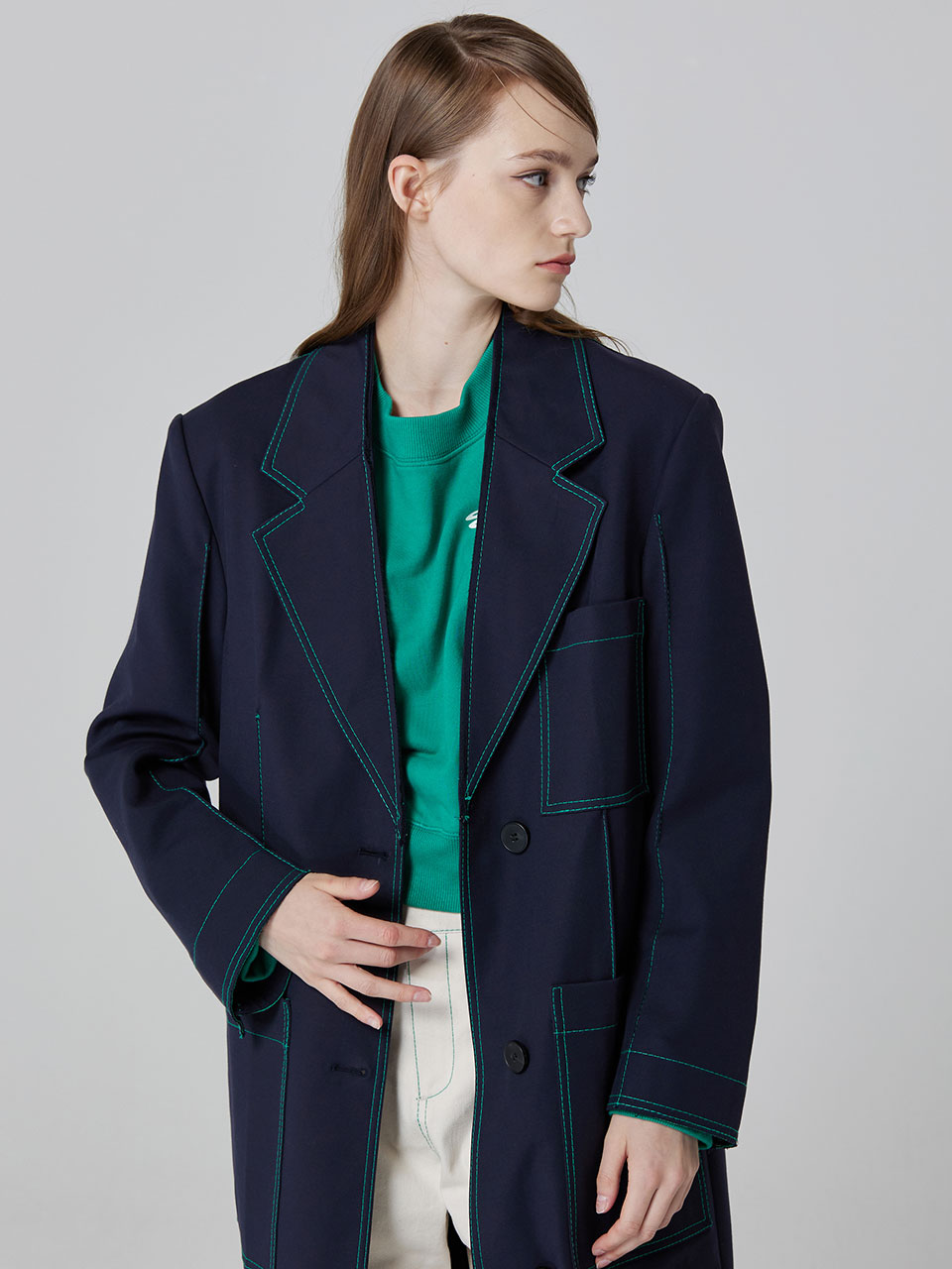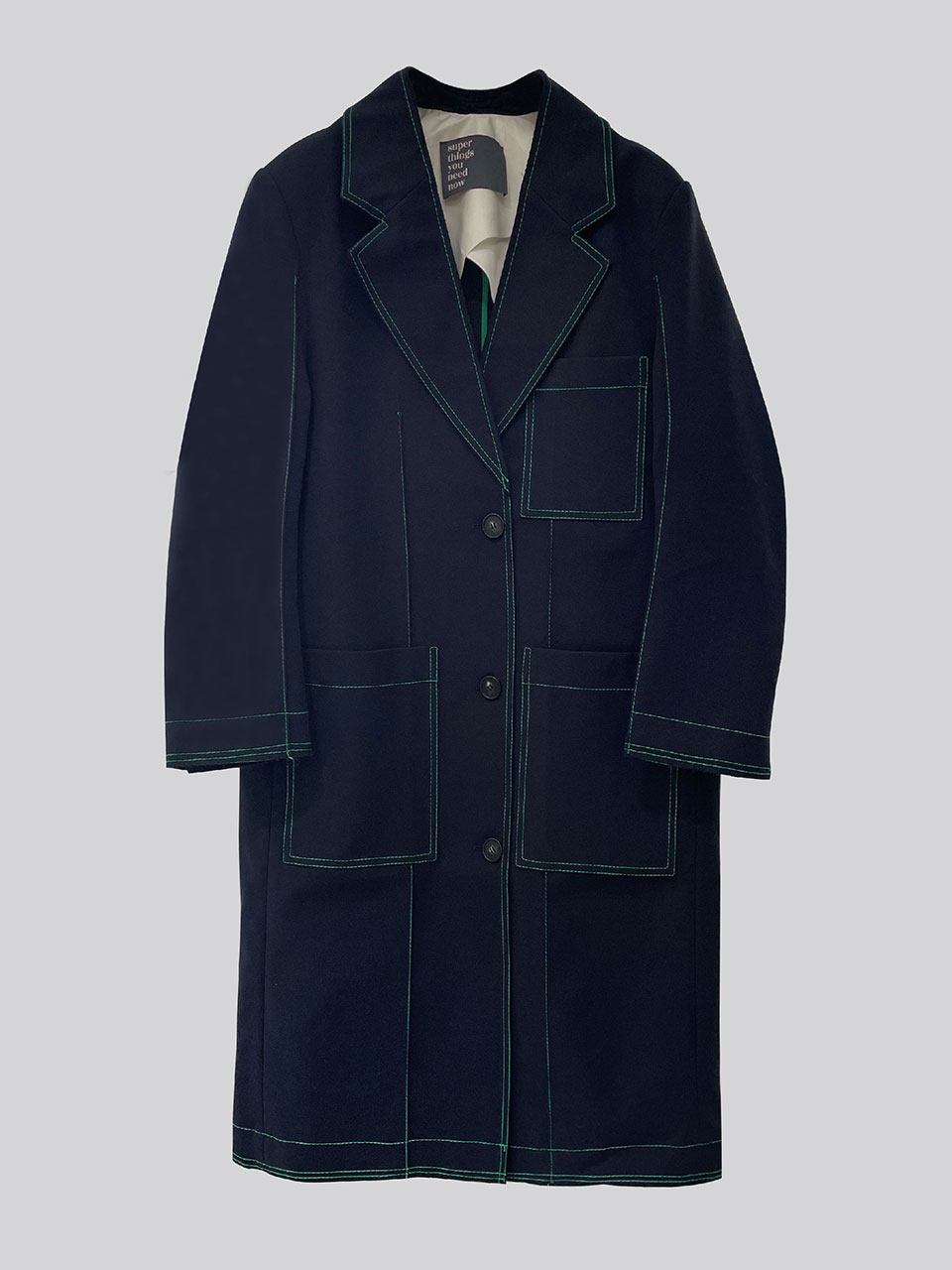 - 배색 스티치가 돋보이는 스탠드 롱 자켓입니다.